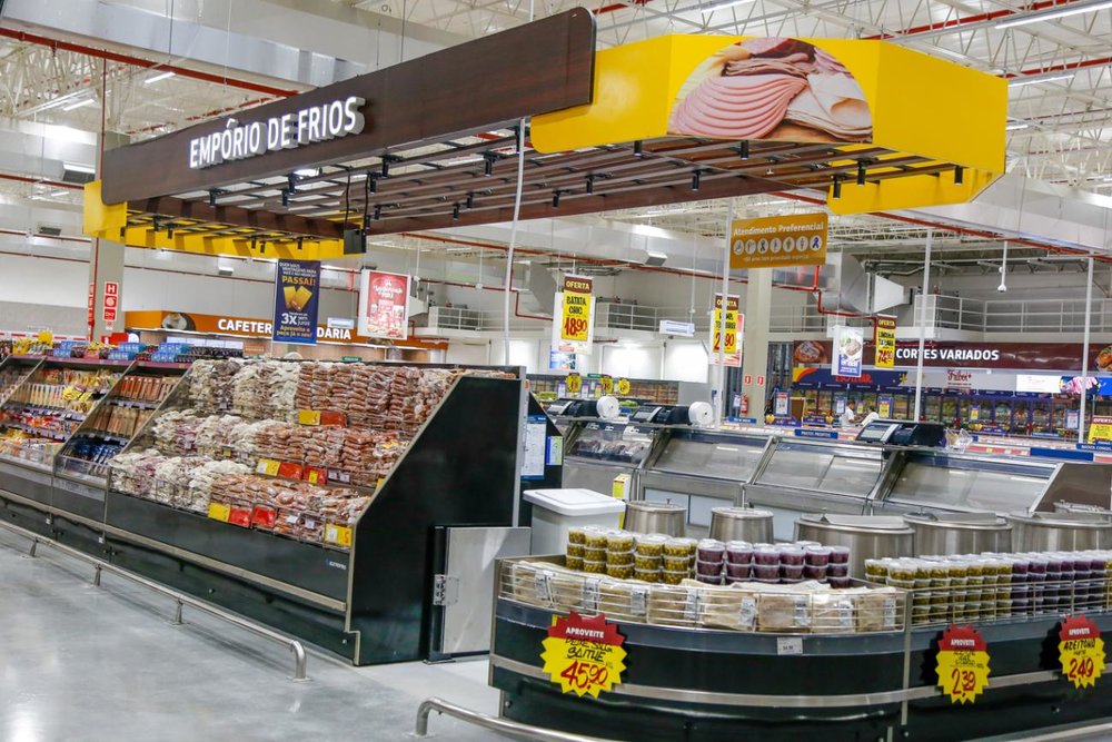 A loja também dispõe de uma ampla gama de serviços como açougue com atendimento especializado para cortes bovinos, suínos e de aves, além do empório de frios com fatiamento na hora e seção de padaria e cafeteria com pães quentinhos assados de hora em hora.